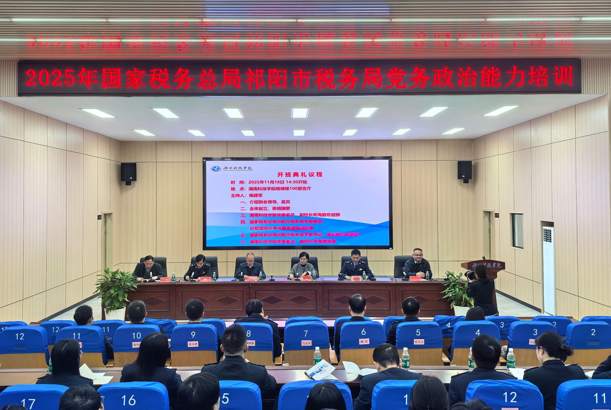 本网讯(通讯员 邹小阳)11月18日,2025年国家税务总局祁阳市税务局党务政治能力培训班在我校开班。校党委委员、副校长何海,祁阳市税务局党委书记、局长欧小林等领导出席开班仪式。来自该市税务系统的52名干部齐聚一堂,开启集中学习之旅。
